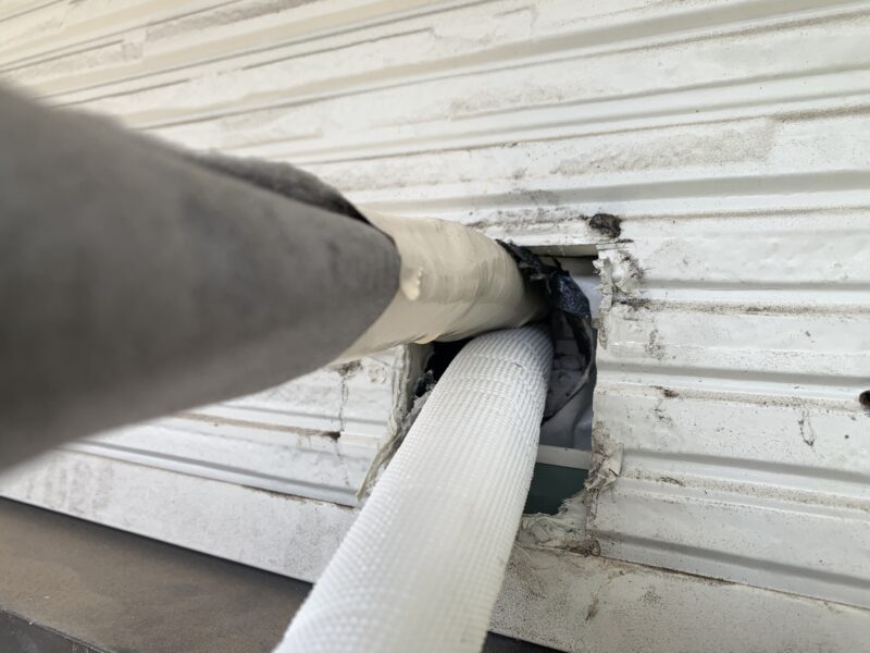 ↑写真は斜めから撮っているのでちょっとわかりにくいかもしれませんが1/3くらい外壁が配管穴に被っていました。そのままの状態でもギリギリ配管は通りそうだったので配管の角度や向きを調整しながらエアコンを取り付けました。配管を通した様子が↓の写真です。