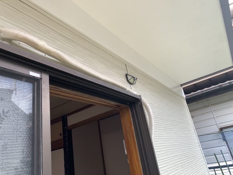 状況的には戸建1階、コンセントあり、配管穴ありという状況でしたが、リフォームによって外壁が古い外壁の上から貼られている状況で、新しい方の外壁には配管を出すために穴が開けられていたのですが、既存の配管穴位置と若干ズレていました↓