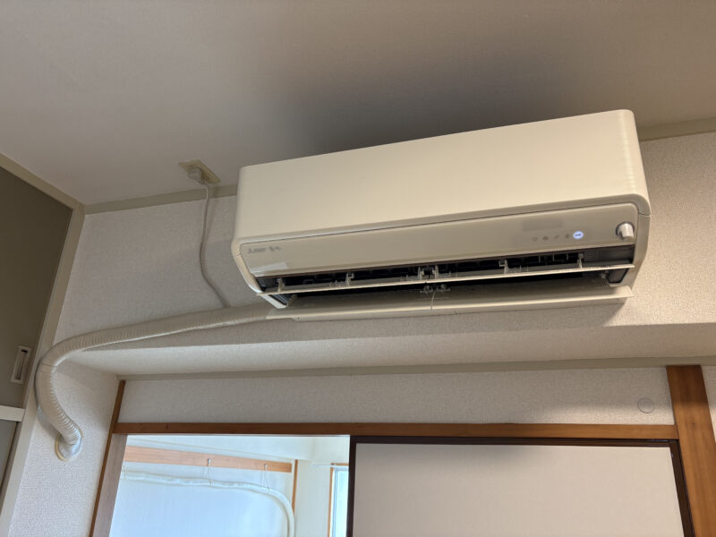 中部屋への取り付けです。こちらの中部屋は珍しくエアコン用コンセント、配管穴、公団ボルトがあるという状況。配管は奥にある和室を通り、外に出て、ベランダにある室外機につながります。室内を配管が長く通るのでドレンホースは断熱ドレンホース(結露防止)を使い、ベランダまで緩やかな勾配をとりながら施工しました。水試験も問題なし!